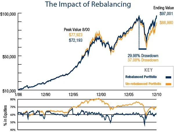 For a long term asset allocation based investor, rebalancing is an integral part of the management of the portfolio. Making sure the portfolio is being “snapped back to grid” over different market cycles is critical. Consider the following chart which shows 2 portfolios that began with the same exact investment strategy. One portfolio was properly rebalanced periodically and the other portfolio was left untended.