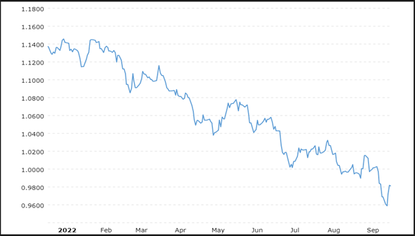 In fact, the dollar has appreciated over 16% since January as of the end of the 2022 third quarter market close as shown in the following price trend chart (Table 1) illustrating the declining value of the Euro versus the dollar: