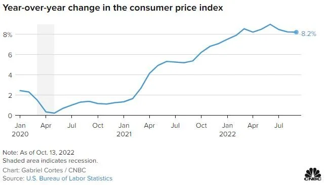 On Thursday, October 13th the U.S Bureau of Labor Statistics (BLS) data confirmed consumer prices rose 0.4% in September. This puts prices up 8.2% from a year ago. If you exclude food and energy, the Consumer Price Index (CPI) rose 0.6% or 6.6% year over year. This yearly gain on core (removing food and energy) is on pace for the highest since august of 1982. While October’s reading is below the peak number we saw in June, it is still hovering around the highest levels since the early 1980s.