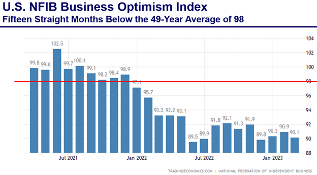 The National Federation of Independent Business' ("NFIB") latest release of its Small Business Optimism Index paints a shocking picture of just how tough conditions are becoming on Main Street. That index marked 15 consecutive months of declines with readings well below its 49-year average of 98 (chart above).