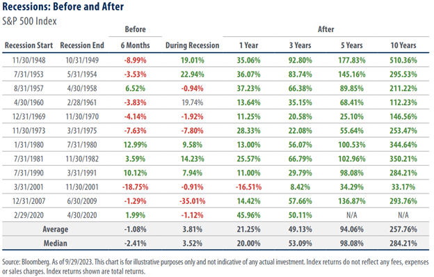 There have been 12 recessions in the U.S. going back to the 1940s. On average U.S. equities have declined over the 6-month period prior to when the recessions began, then turned modestly positive during the recession, and have rallied dramatically as the recessions began to give way to new periods of expansion.