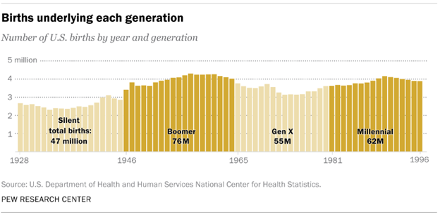 /As of 2019, the Millennial generation (those born between 1981 and 1996) officially surpassed the Baby Boomers as the largest living population group in the United States (Source: Pew Research). While much of our commentary and attention focuses on current trends and data, it can be easy to be so focused on the here and now that larger structural trends, like demographic trends, go unnoticed. While these current trends and data are critical for making tactical investment decisions, it is also important not to miss the forest for the trees given the time horizons our clients are typically working with.