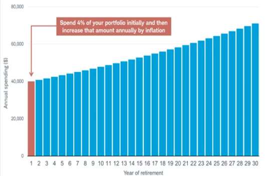 Here's a simplified example of this: If you have $1 million saved for retirement, the 4% rule suggests that you can withdraw $40,000 in the first year ($1 million x 4%) and then increase this amount at the rate of inflation in the following years (i.e. 2% inflation rate shown in the illustration below).