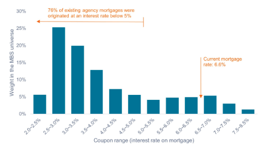 Refinancing/Prepayment risk is lower than normal. As shown below, 76% of mortgages have an interest below 5%. It would take a significant further drop in interest rates to spur a wave of refinances.