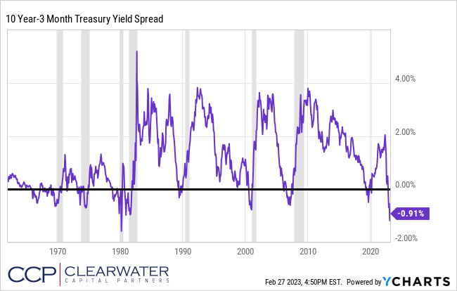 While there are many points along the yield curve that can be measured, one of the more popular yield curve measurements is the difference in yields (spread) between the 10-year Treasury bond and the 3-month Treasury bond. The chart below tracks this spread going back to the 1960’s along with the shaded grey areas that indicate recessions. Any time the spread goes below 0% reflects an inverted yield curve and, as you can see, there are plenty of examples where we had an inverted yield curve before a recession. It should be noted that although there are plenty of times in history where an inverted yield curve has indeed signaled a recession, there are times where it has given a false signal.