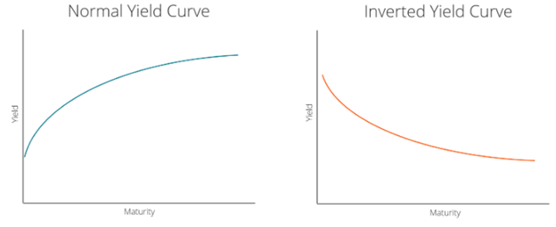 The yield curve is the graphical representation of the difference in interest rates across various maturities as shown below. Typically, the yield curve is positively sloping with the interest rates on longer-term debt being higher than shorter-term debt. This makes sense as the longer you “lock up” your capital, the more risk you are taking, and therefore, you would expect a higher return. However, on rare occasions, you can have an inverted yield curve whereby short-term rates are higher than long-term rates.